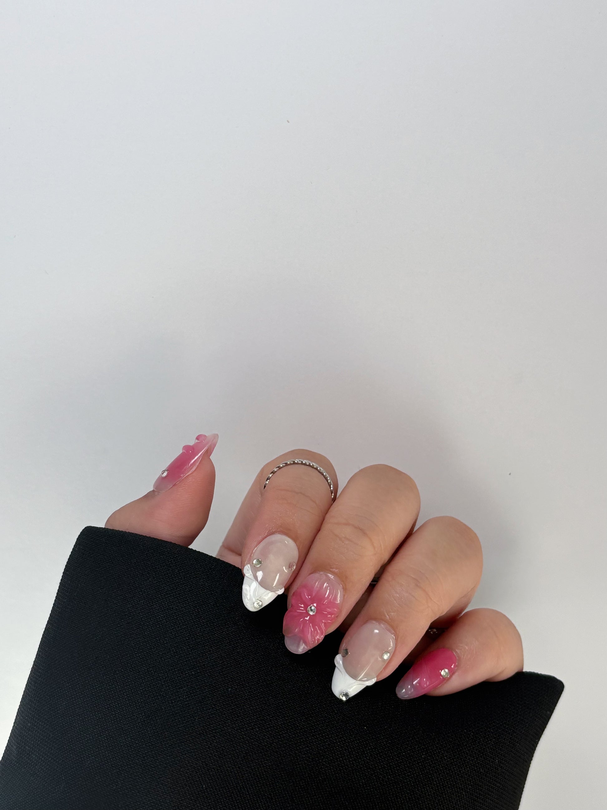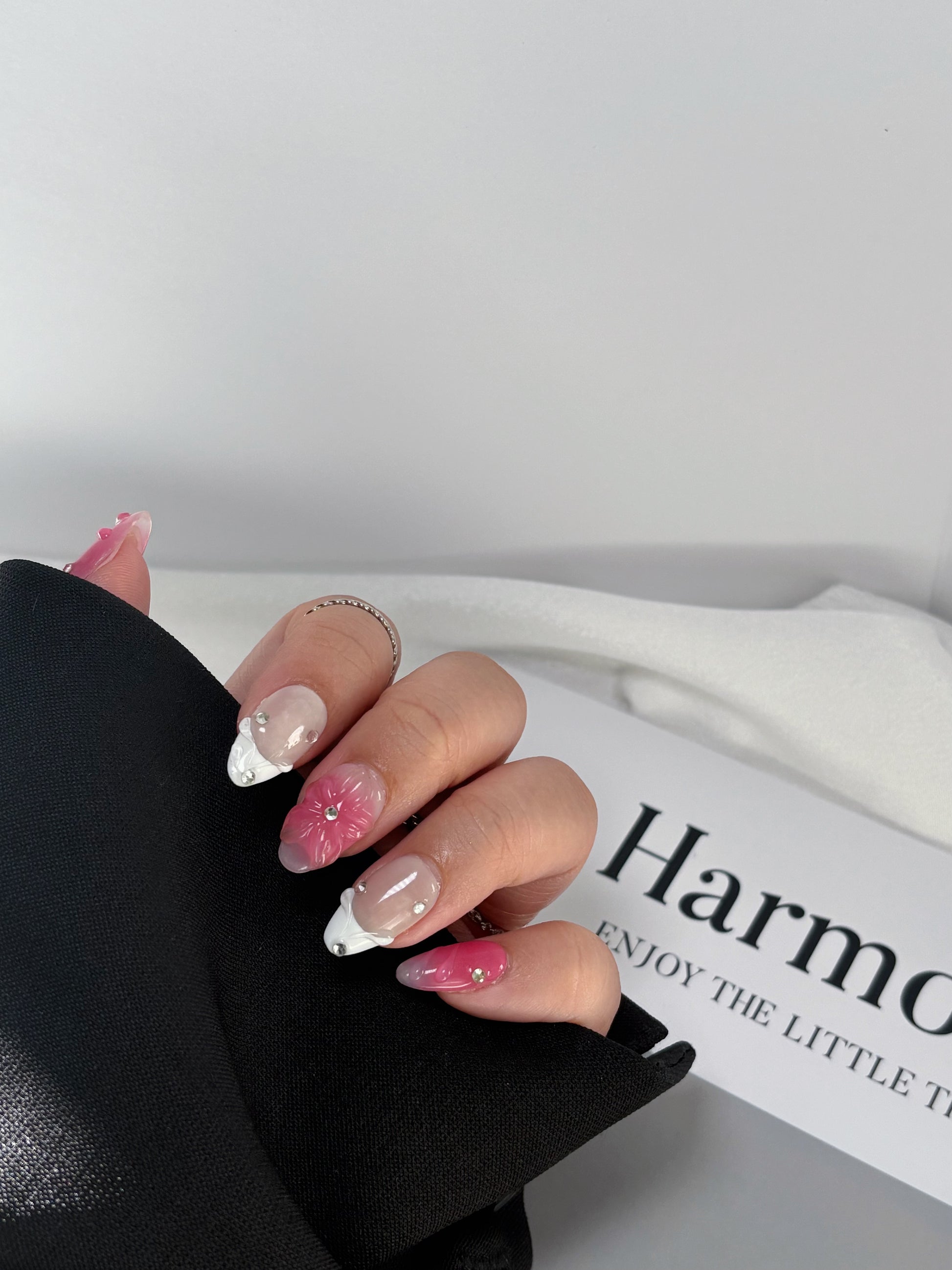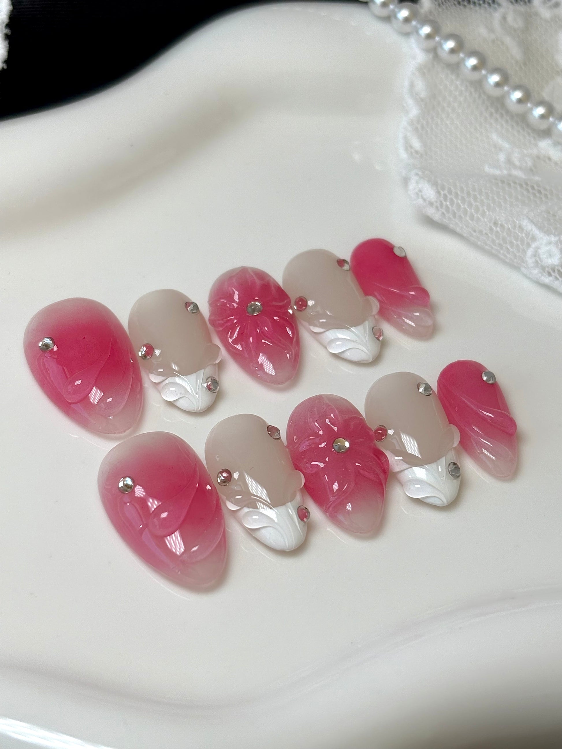 Rosé Whisper features a soft pink ombré with milky beige and white accents, enhanced by delicate 3D floral designs and sparkling rhinestones. Its subtle marbled effect adds depth and charm, creating a dreamy, feminine look — perfect for weddings, romantic evenings, or any occasion that calls for graceful elegance.