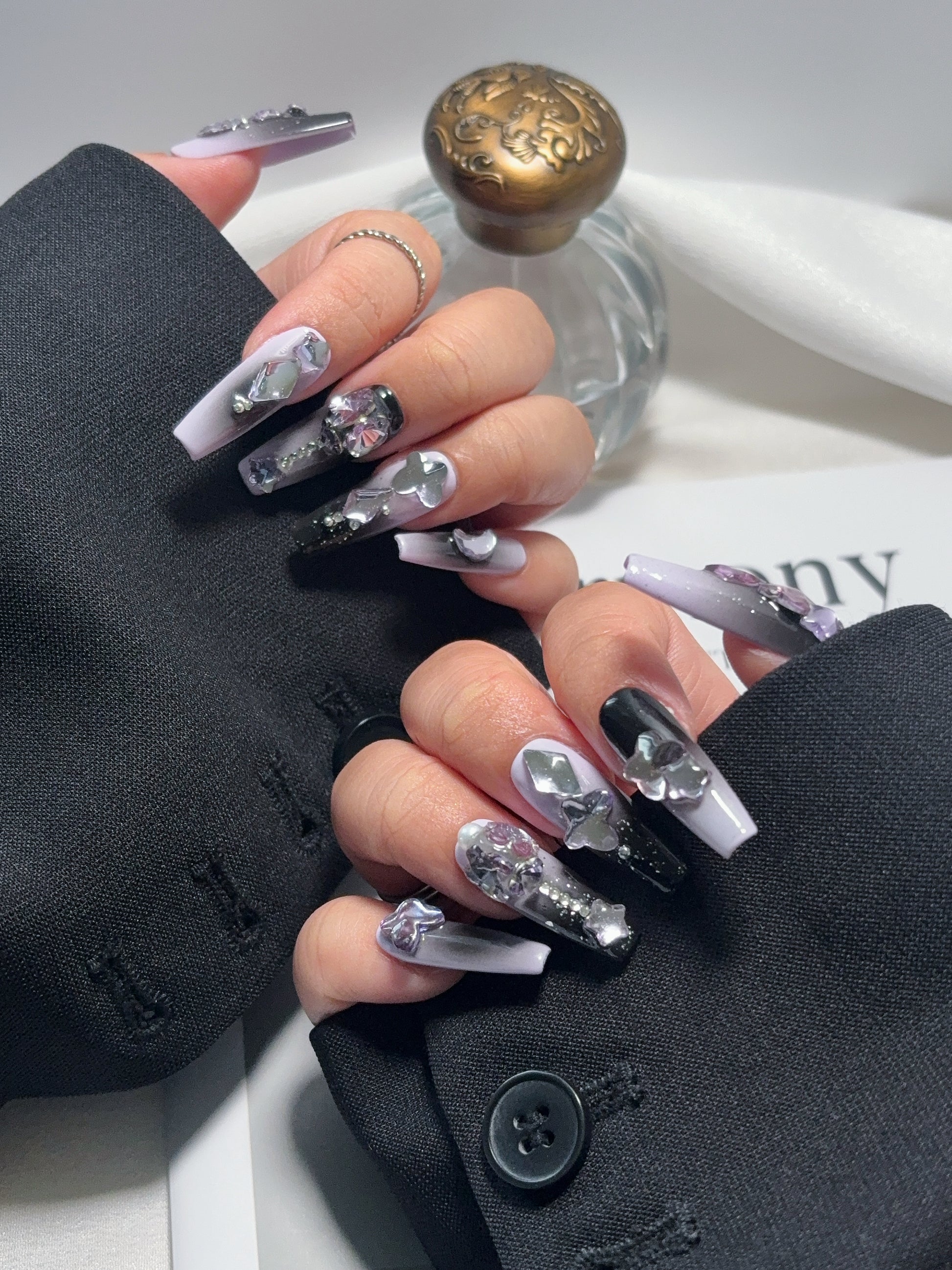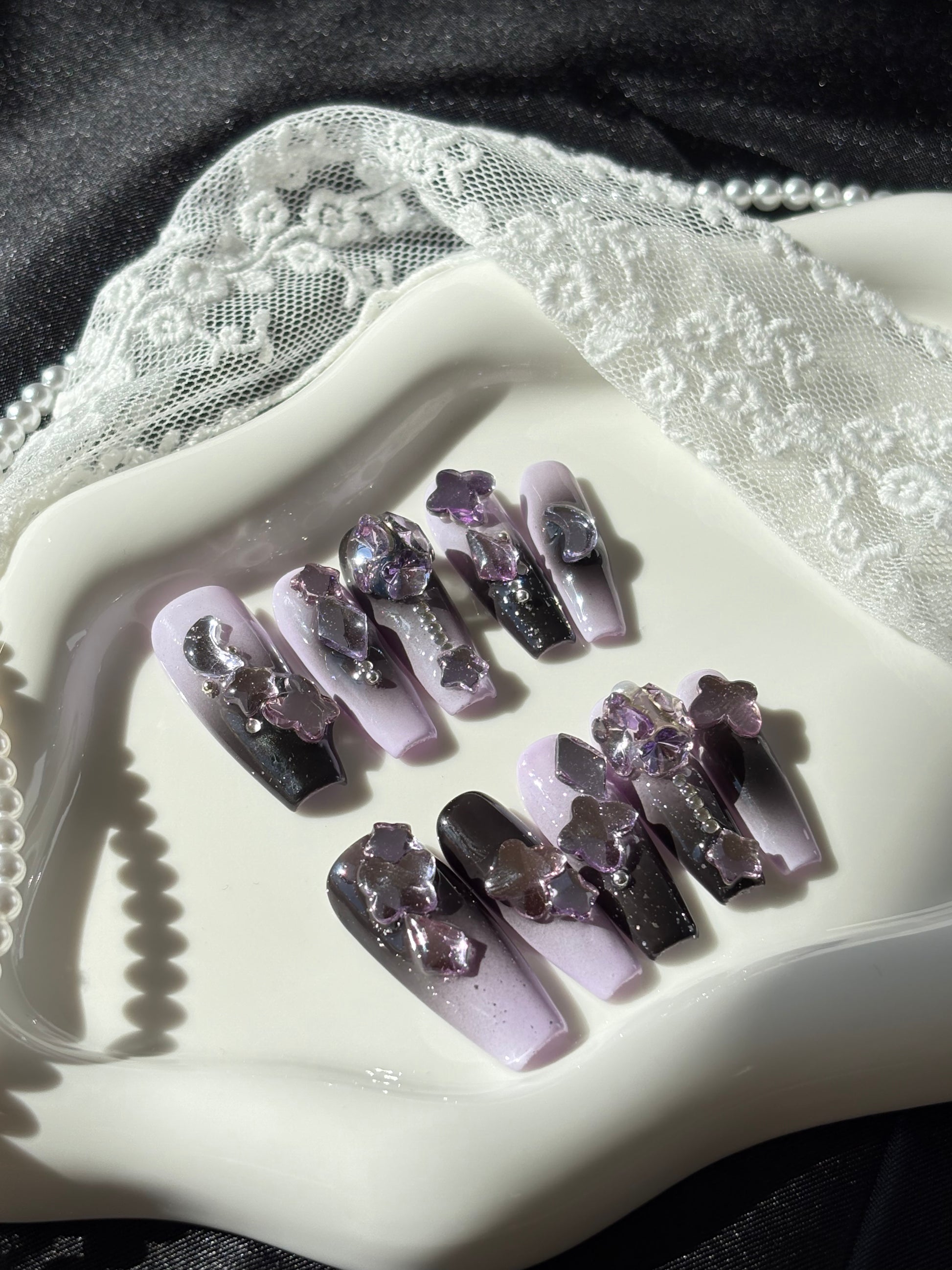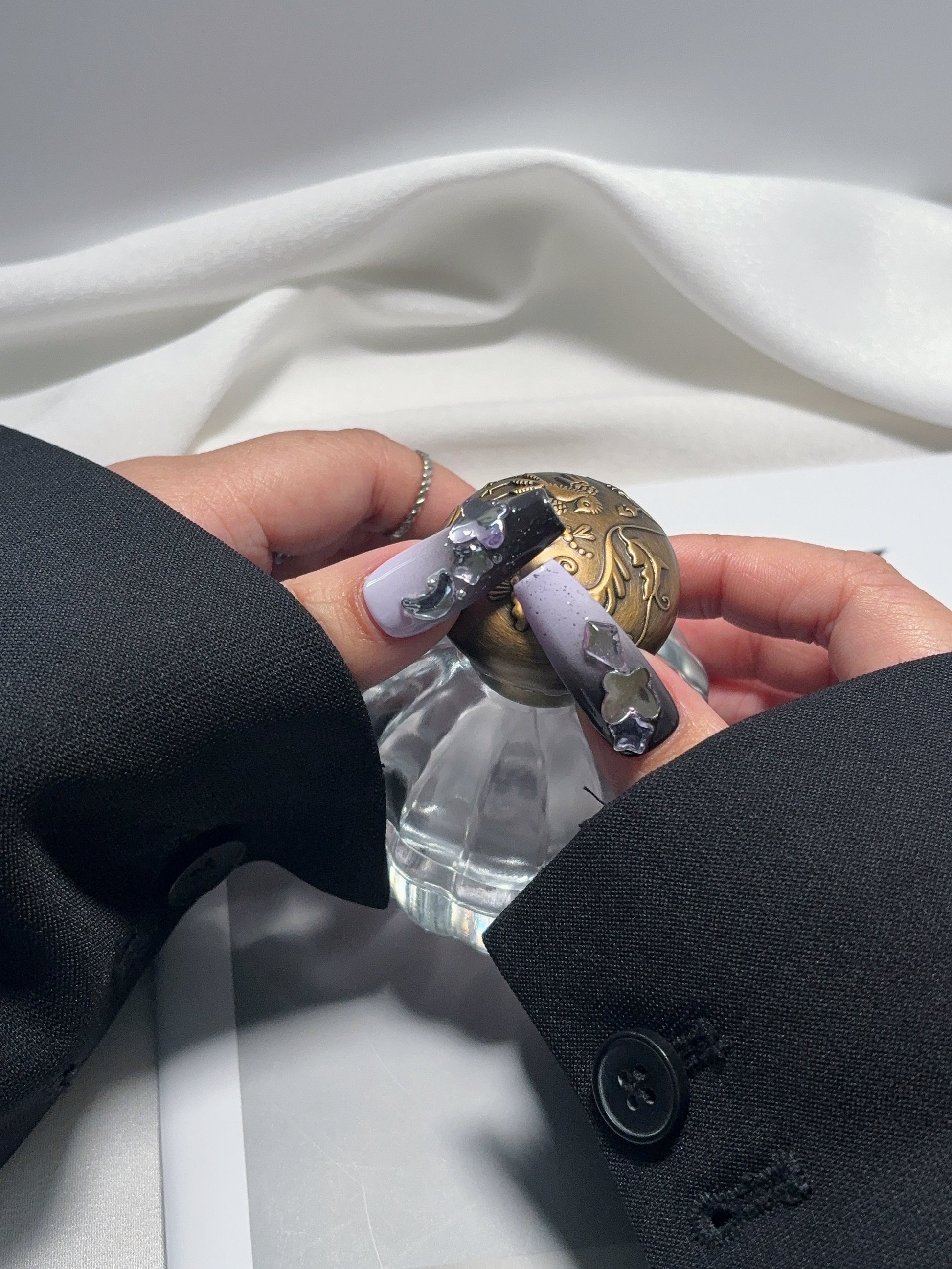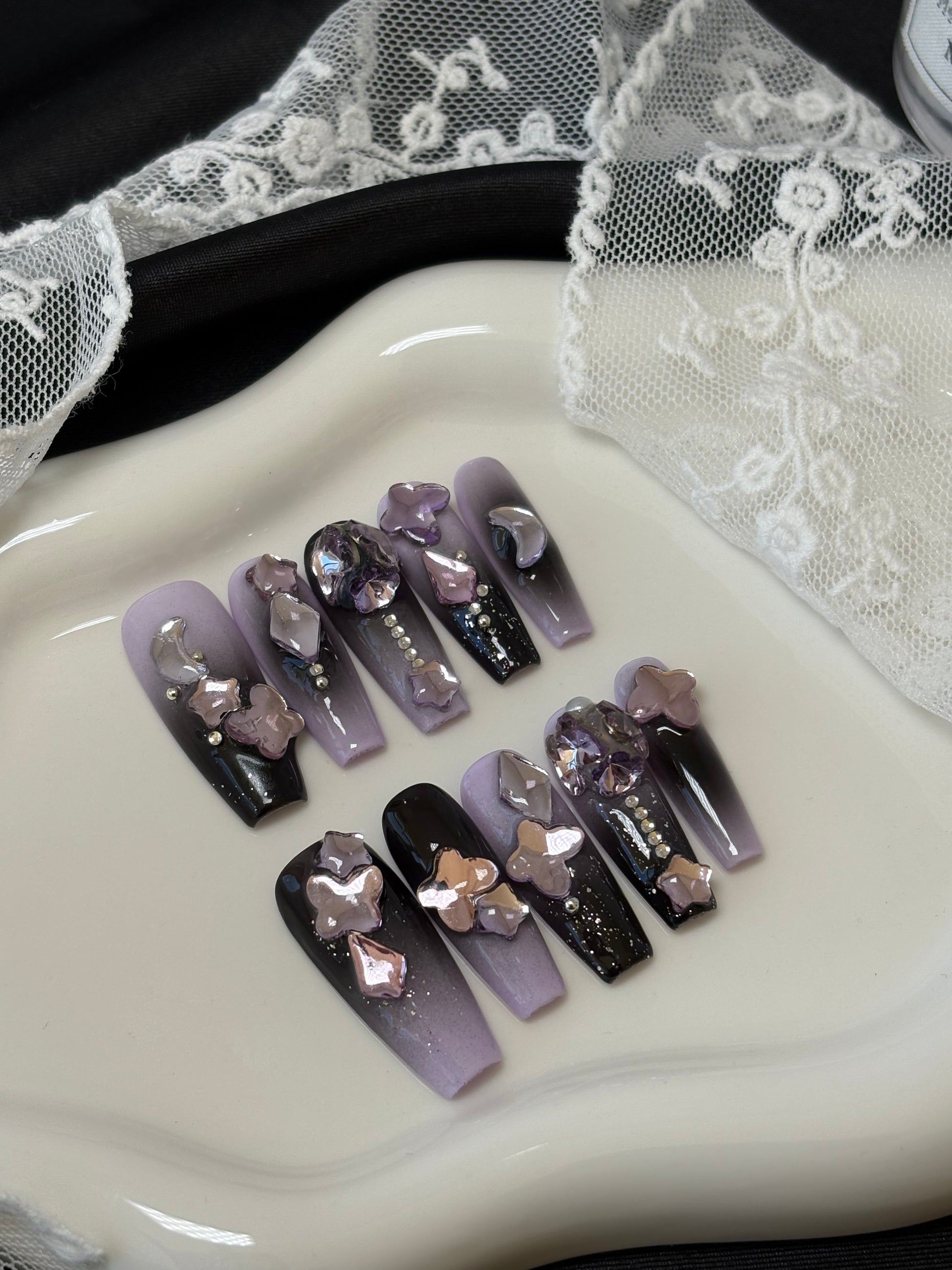 Cosmic Queen is a stunning blend of deep black and amethyst purple ombré, crowned with striking 3D metallic stars, moons, and gem accents. This set brings the magic of the galaxy right to your fingertips — perfect for nights out, festivals, or whenever you want to channel your inner cosmic royalty.