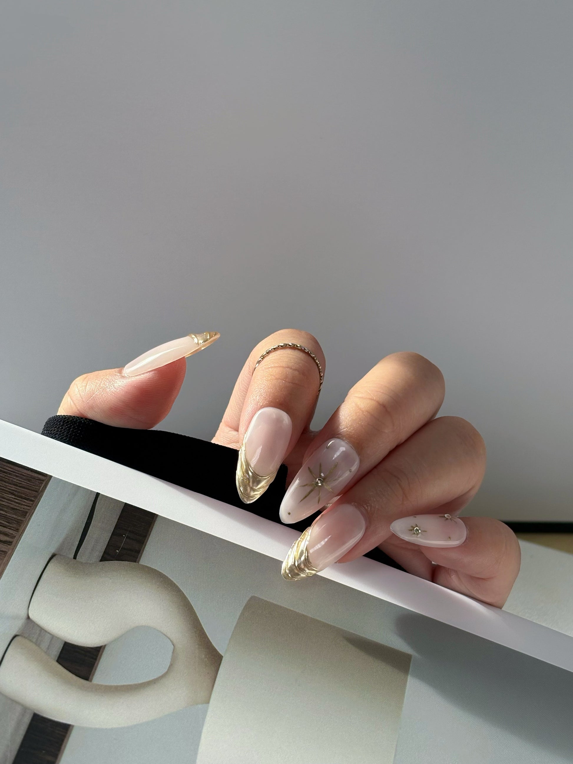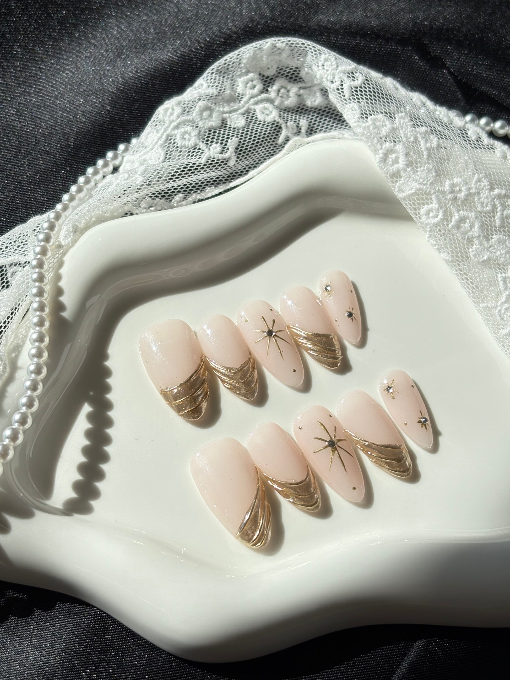 Golden Hour is the ultimate expression of understated luxury — featuring a soft nude base kissed with molten gold swirls and accented by delicate starburst charms with gem centers. This set glows with effortless sophistication, making it perfect for weddings, parties, or any moment that calls for a touch of golden glamour.