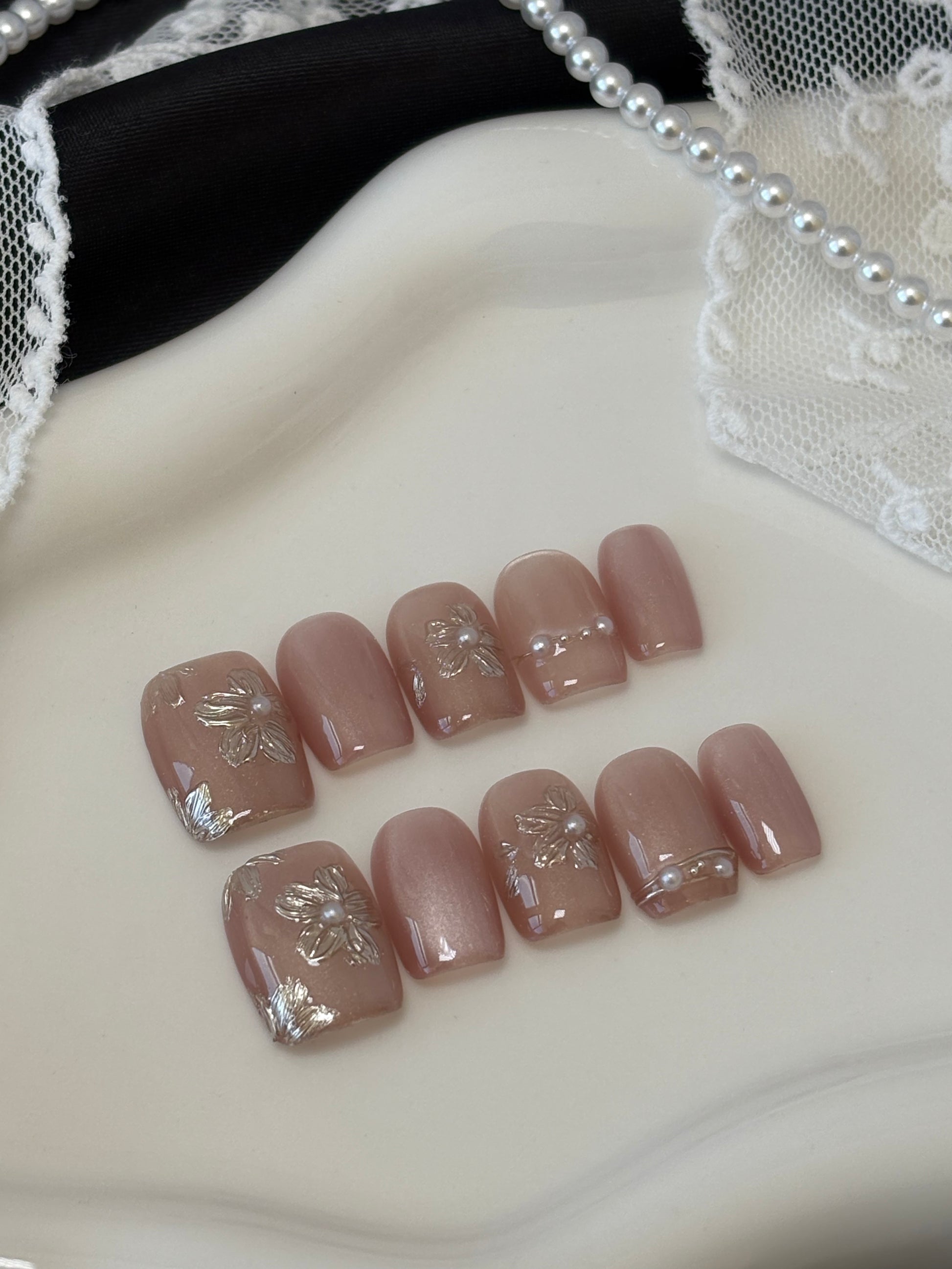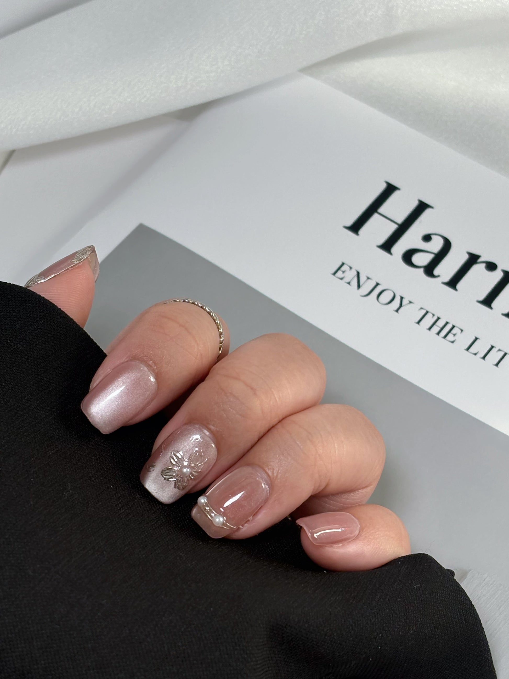 Petal Kiss features a delicate blush pink cat-eye base with a mesmerizing, light-reflecting shimmer, adorned with shimmering silver floral accents. The cat-eye effect adds a touch of magic and depth, creating a look that’s both graceful and enchanting. Perfect for weddings, date nights, or anytime you want your nails to whisper romance, this set brings a gentle kiss of beauty to every fingertip.