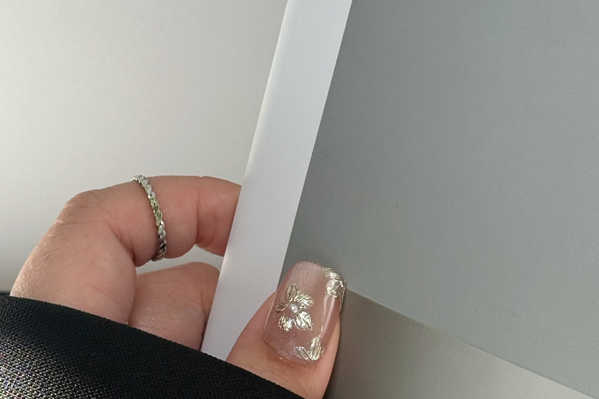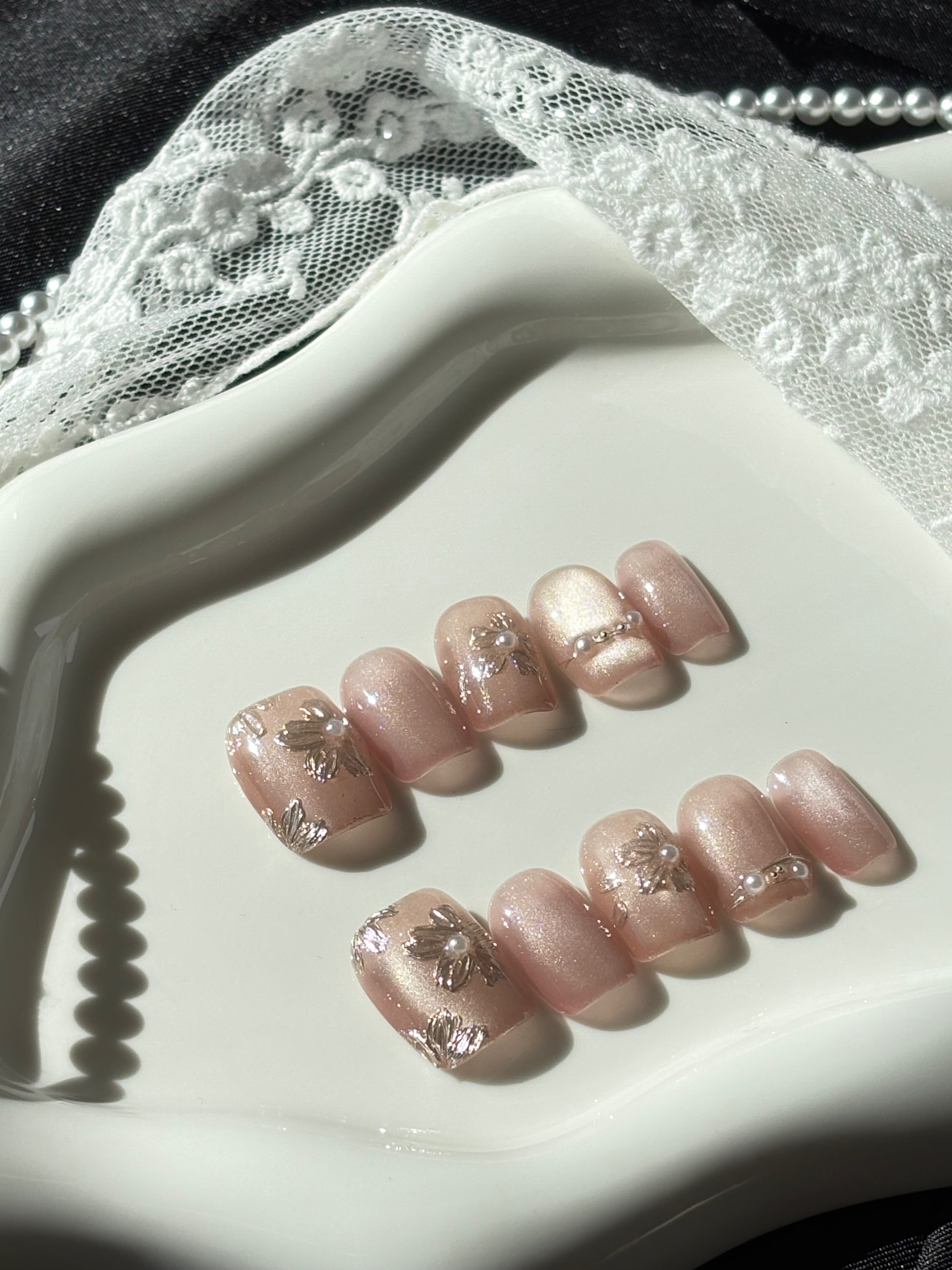 Let your fingertips bloom with Petal Kiss — a touch of floral charm and captivating shimmer for your everyday elegance.