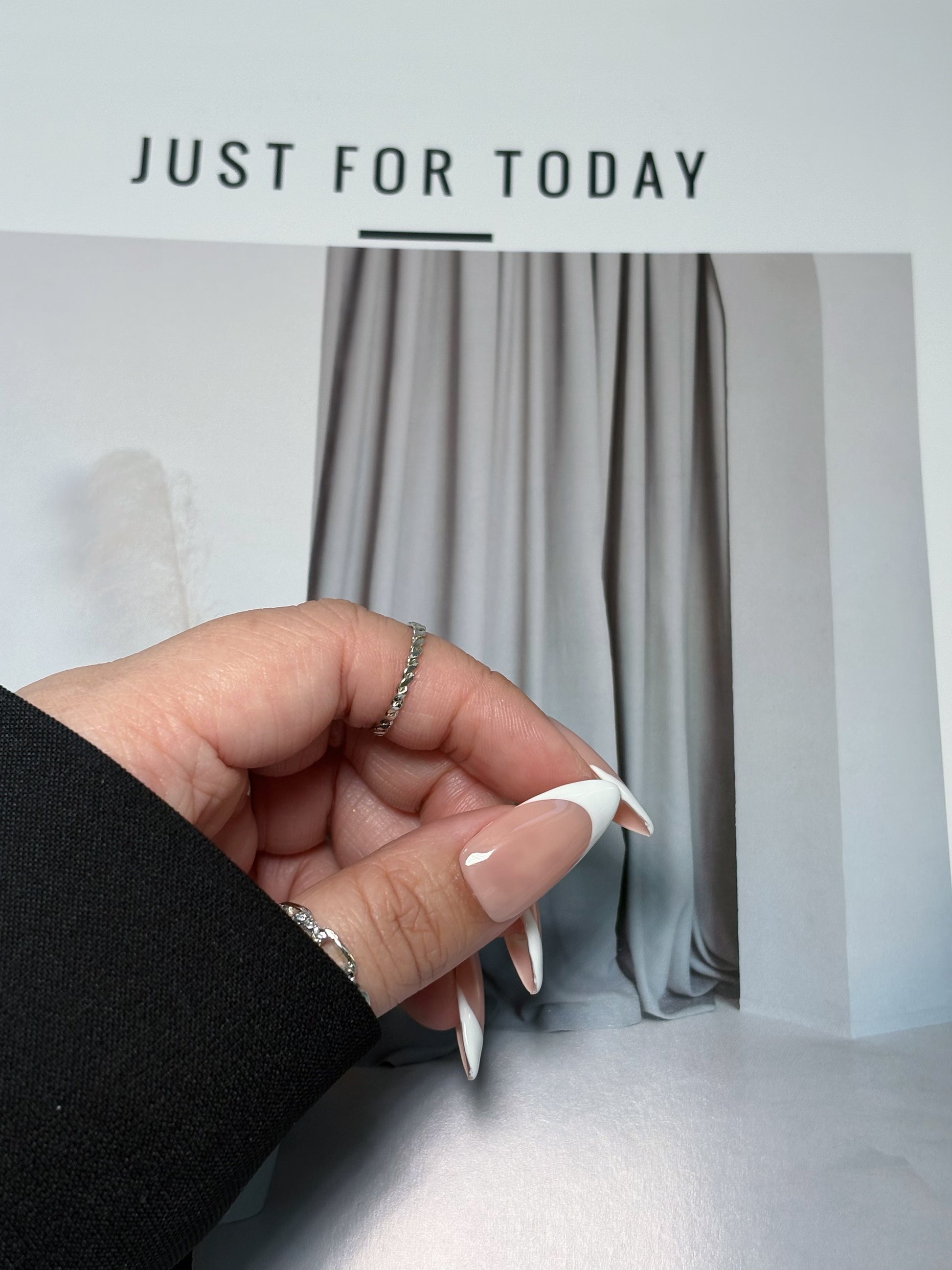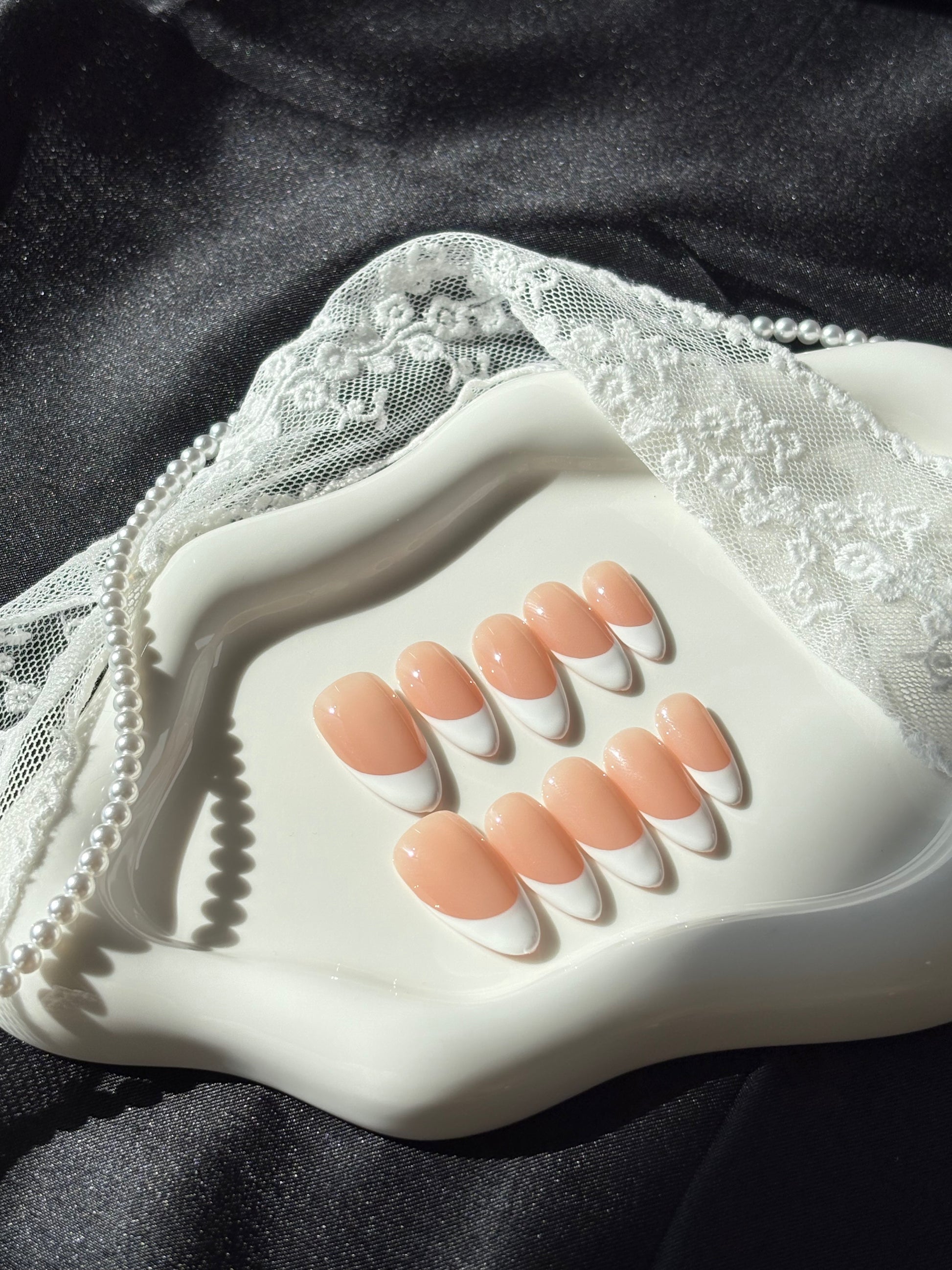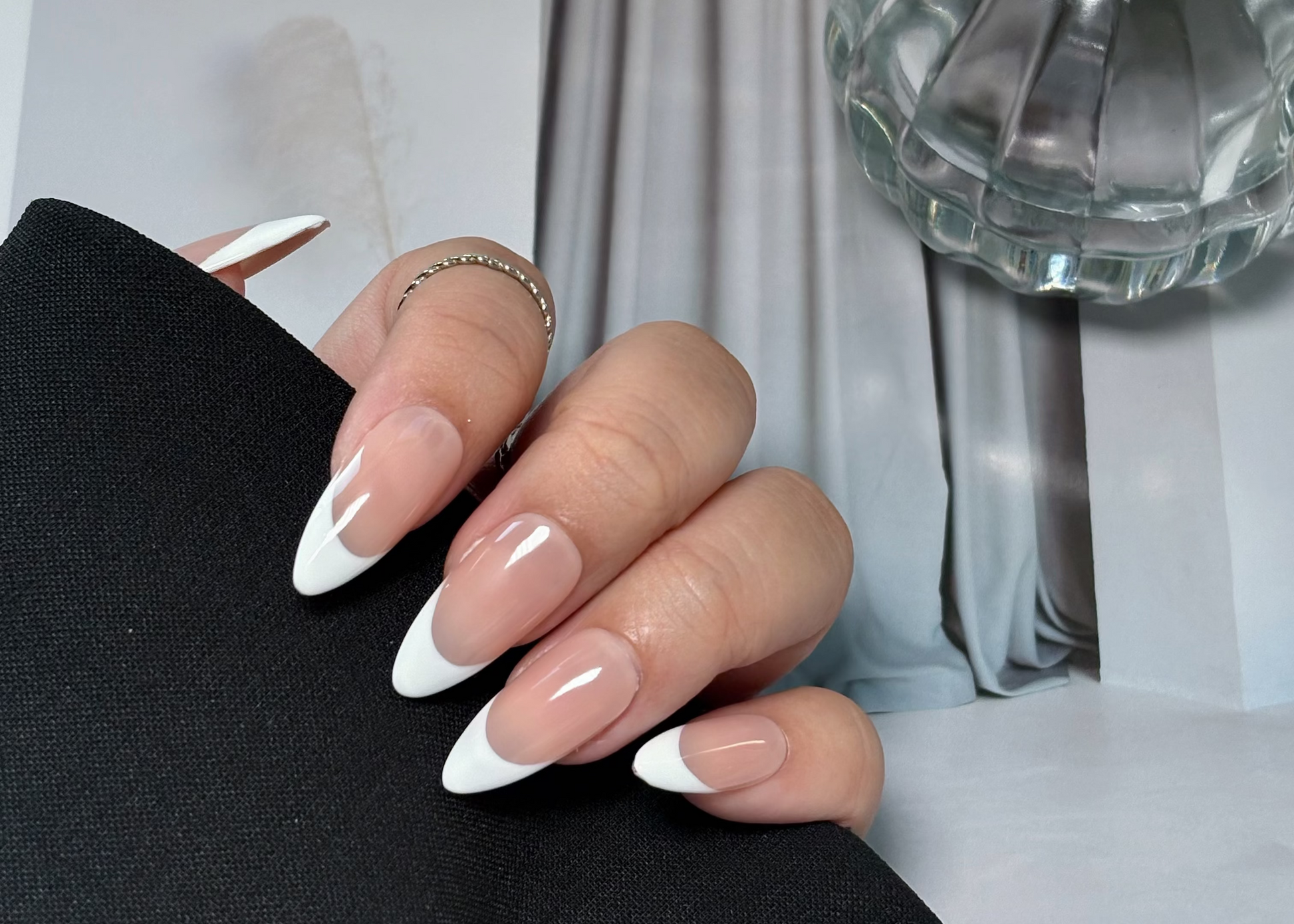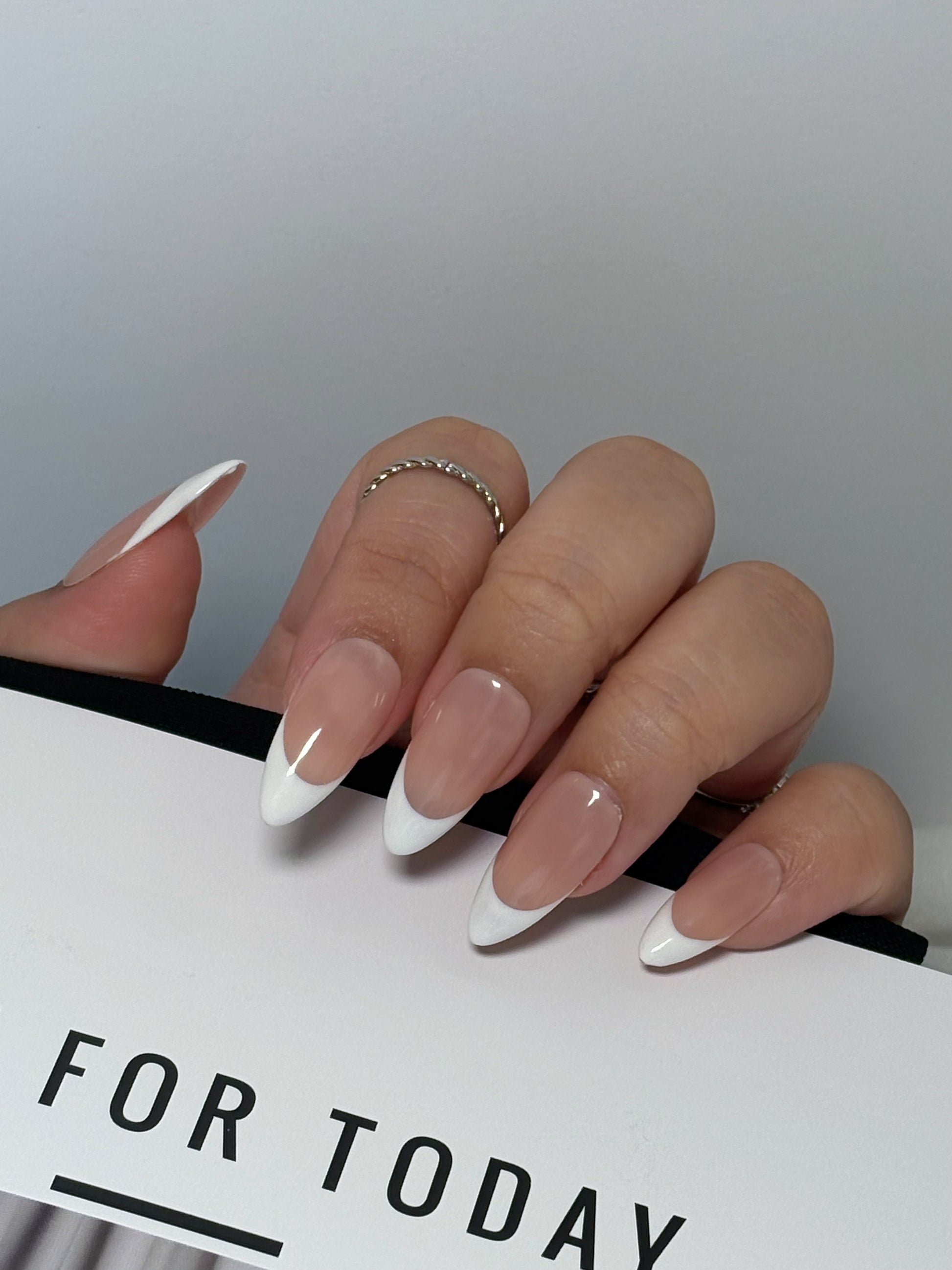 Pure French showcases the beauty of a classic French manicure with almond-shaped nails, a soft nude base, and crisp white tips. This iconic design never goes out of style — perfect for weddings, everyday sophistication, or anytime you want your nails to look polished and refined.